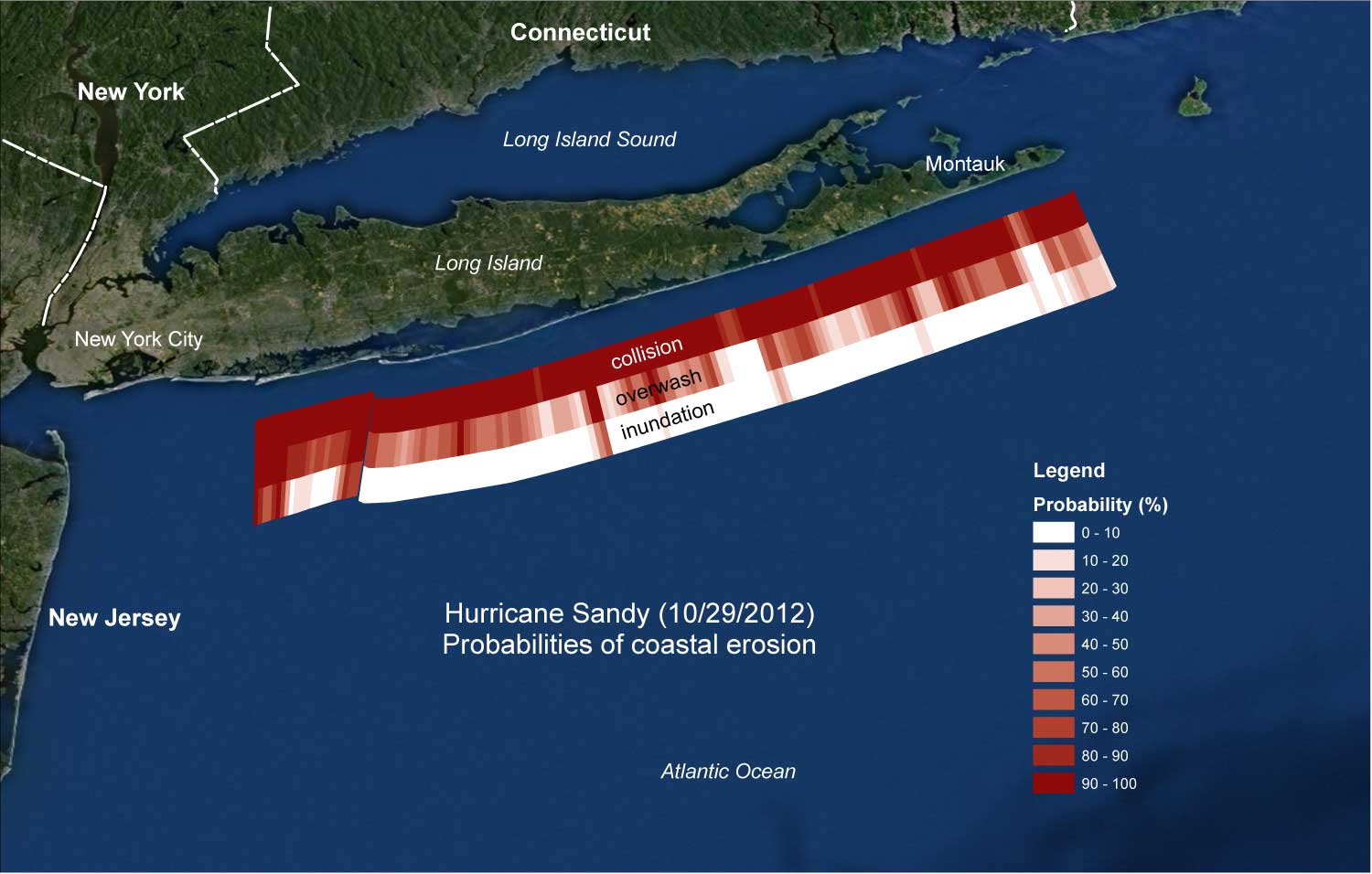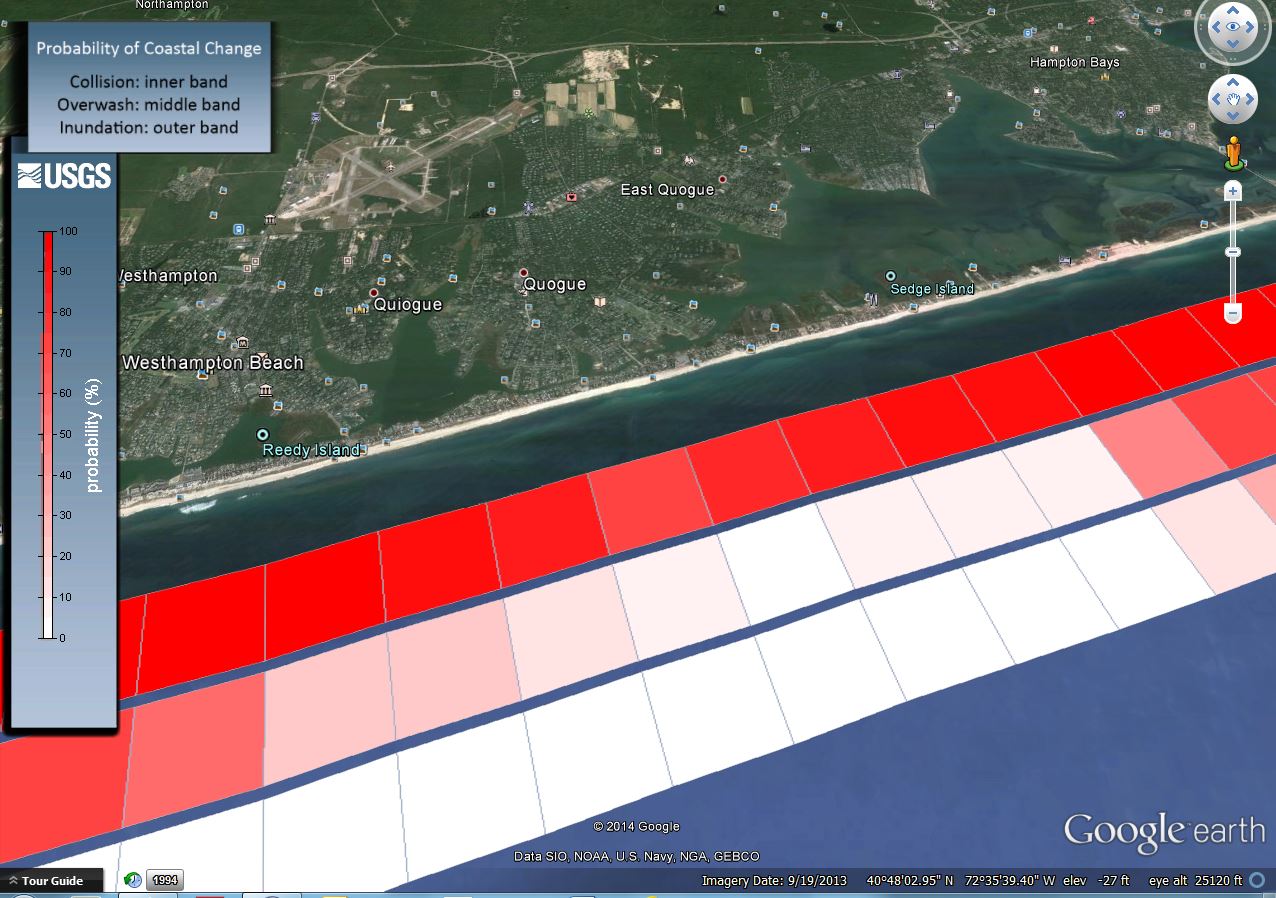- The U.S. Geological Survey probability study on Long Island coastal change concludes that there is an extremely low probability of inundation and only a limited likelihood of severe overwash. Protecting against a potential breach of the barrier island appears to be unnecessary. The conditions in Quogue are materially different and less severe than the Village of West Hampton Dunes, often cited by nourishment advocates as a model success.